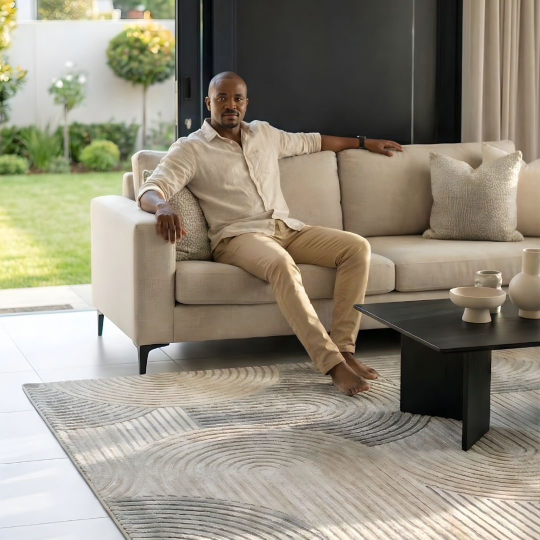 This Carpet has a modern, Geometric design with repeating arcs and straight lines. The mix of curves and lines creates a lively look, and the raised pattern adds a texture, Touchable feel.